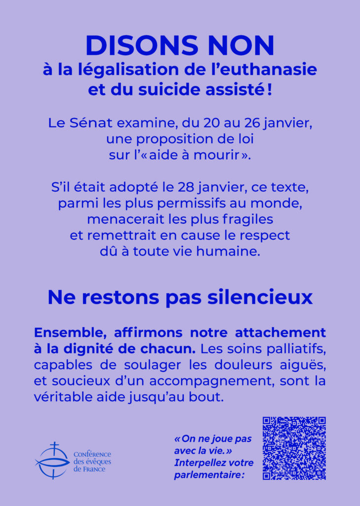 Le Sénat examine du 20 au 26 janvier 2026 une proposition de loi sur l’“aide à mourir”. S’il était finalement adopté à l’assemblée, ce texte, parmi les plus permissifs au monde, menacerait les plus fragiles et remettrait en cause le respect dû à toute vie humaine. Ne restons pas silencieux. Les évêques de France réaffirment leur opposition à la mort provoquée, rappellent l’urgence de donner la priorité aux soins palliatifs et invitent à interpeller les parlementaires.